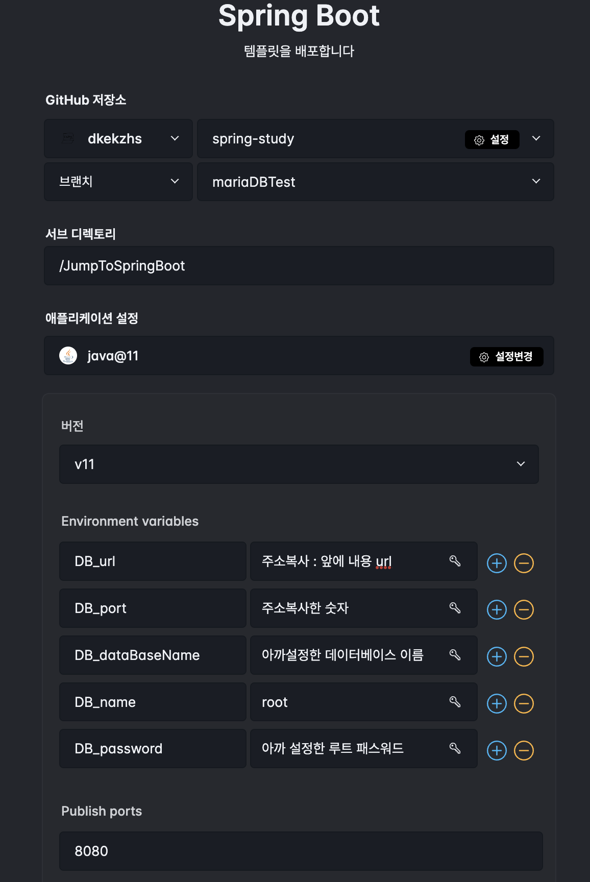Environment variables : 환경변수를 설정하는 칸으로 앞에서 생성한 마리아 DB를 설정해주시면 됩니다. 앞에서 주소복사를 하게 될 경우 url:port 형태인데 DB_url에는 url 주소만 DB_port 부분에는 port만 입력해주셔야 합니다. 이제 환경변수 설정까지 했다면 배포하기 버튼을 누르고 기다립시다.