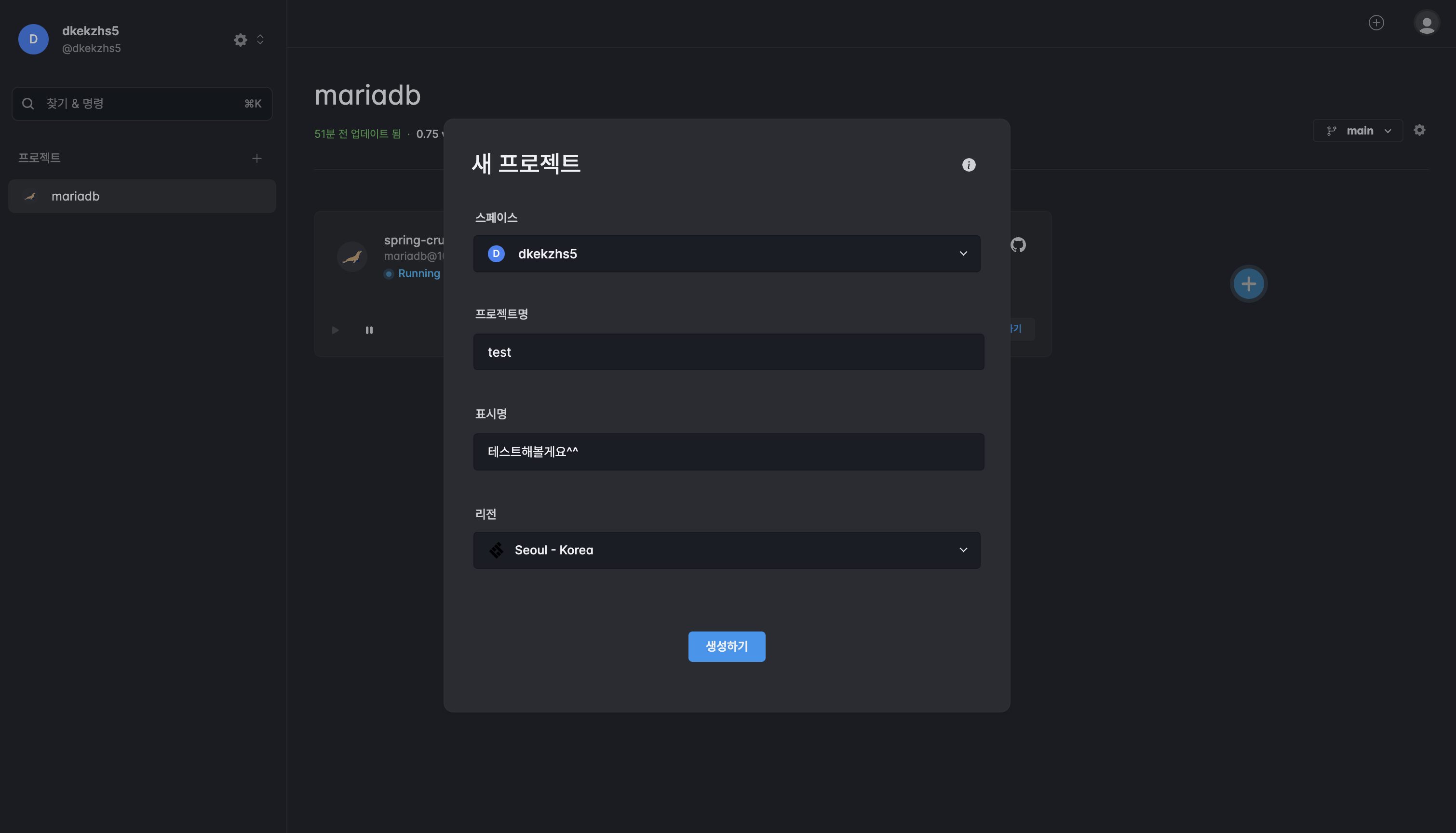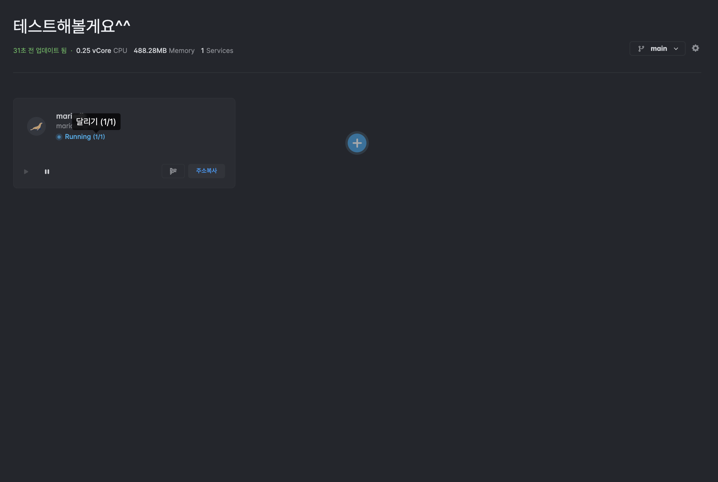 정상적으로 배포된 것을 확인할 수 있습니다. 이제 환경변수 설정하기 위해 mariaDB에 주소를 복사한 뒤 스프링 부트를 프로젝트에서 생성합니다.