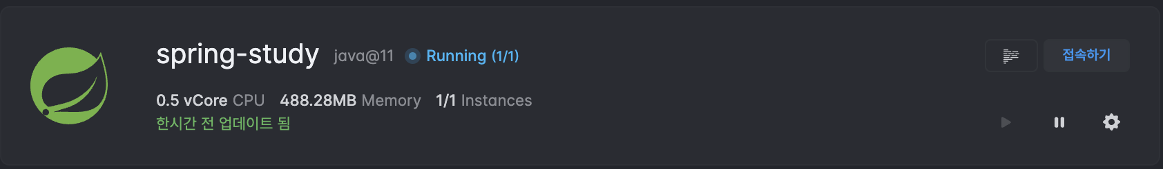 해당 배포가 완료되면 다음과 같이 접속하기가 파란색버튼으로 변경됩니다. 접속하기를 누르면 배포된 서버를 확인할 수 있습니다.